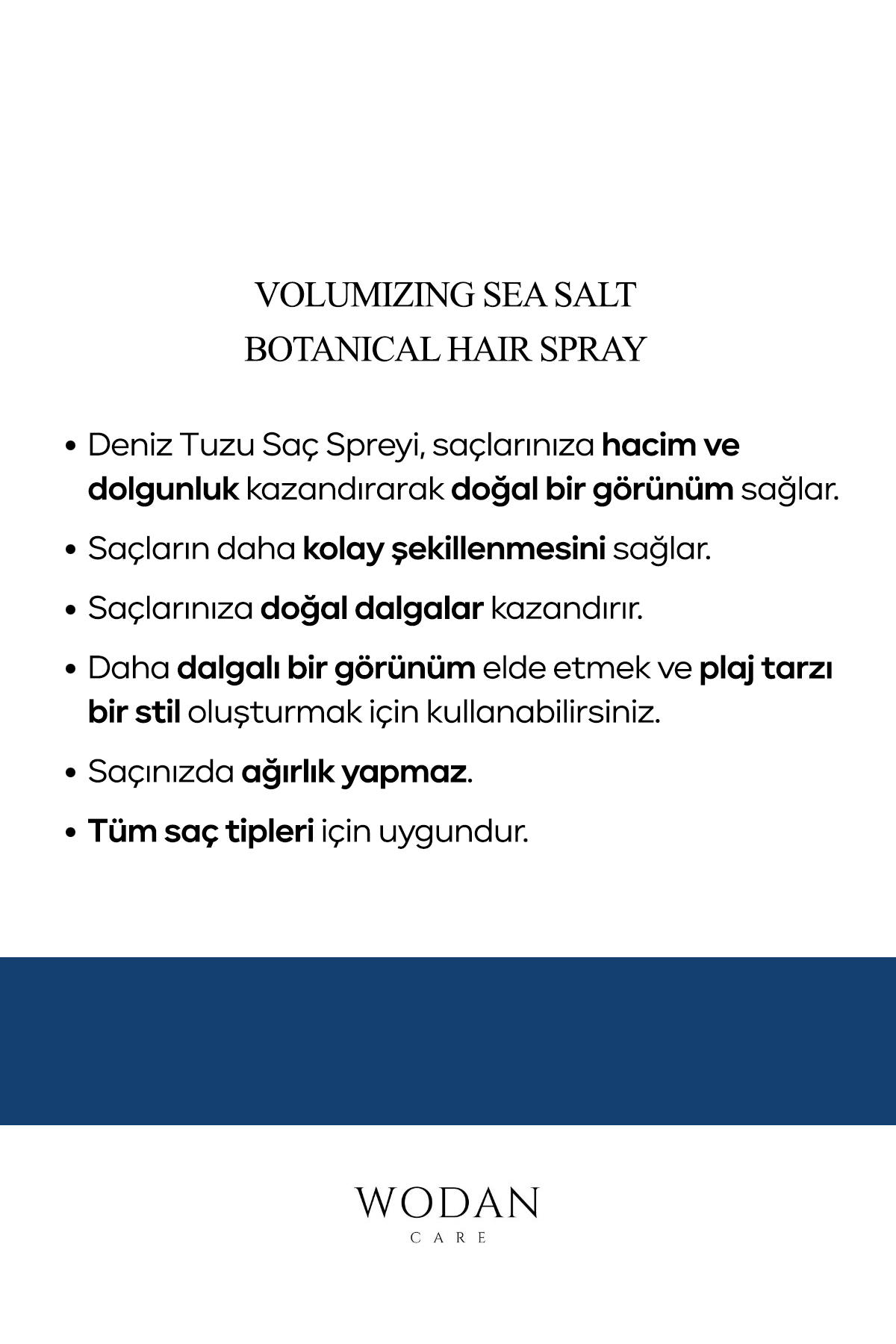 - Deniz Tuzu Saç Spreyi, saçlarınıza hacim ve dolgunluk kazandırarak doğal bir görünüm sağ
